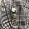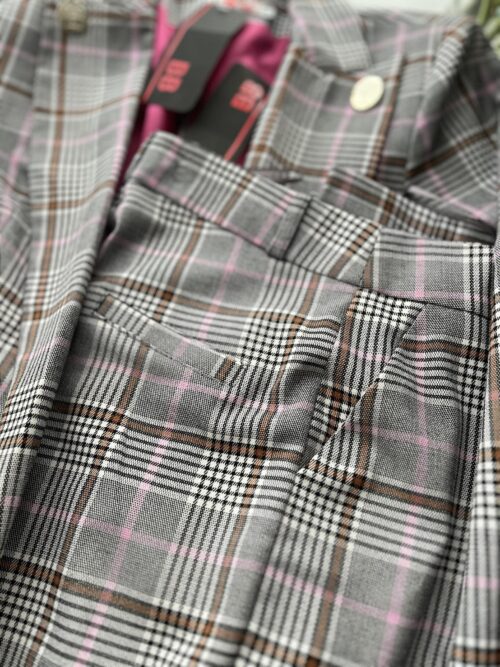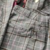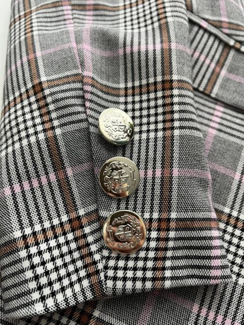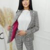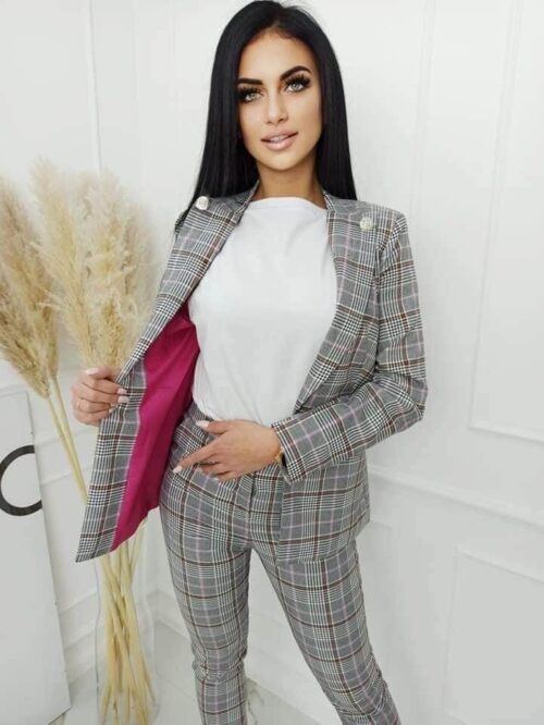 Komplet garniturowy z printem kratkowym, stonowane kolory idealnie pasujące do sezonu jesienno-zimowego. Spodnie z wyższym stanem, kieszonki z przodu. Marynarka dłuższa z wszytymi poduszkami na ramionach, na podszewce. Element ozdobny guziki w kolorze srebrnym.