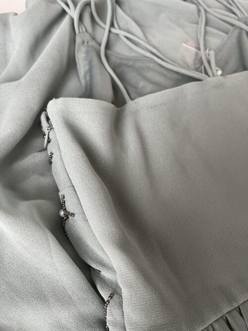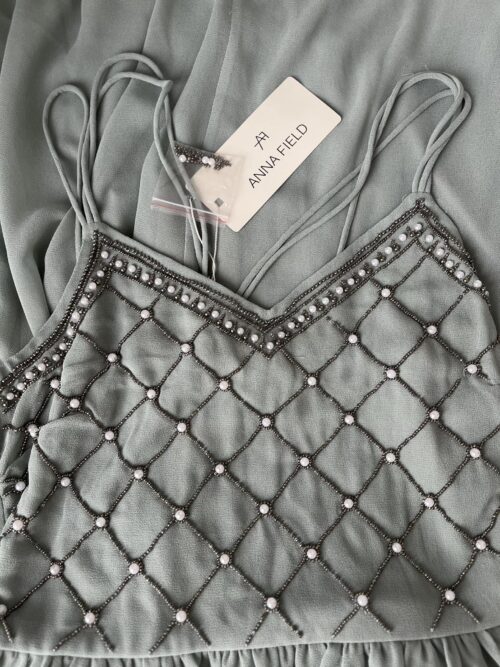 Sukienka balowa długa zwiewana. Na cienkich ramiączkach z ozdobnymi perełkami i innymi dodatkami. Zasuwana z boku na dyskretny zamek.