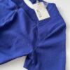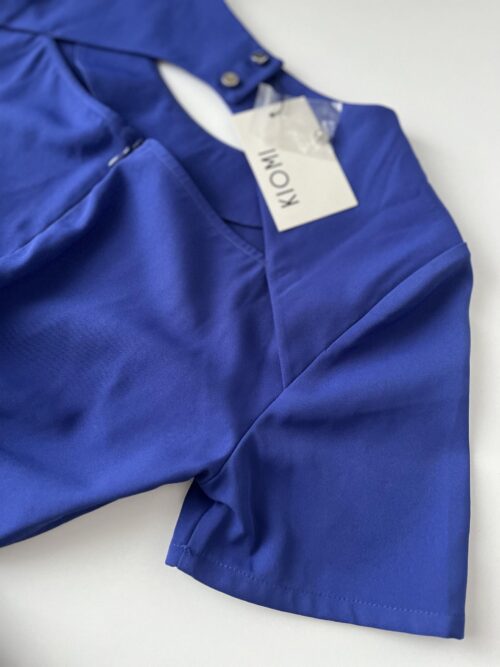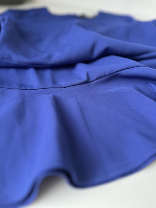 Sukienka w kolorze chabrowym z ozdobną falbaną, dopasowana, krótki rękaw. Z tyłu posiada łezkę (część odkryta), zapinana na suwak, dwa guziki.