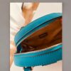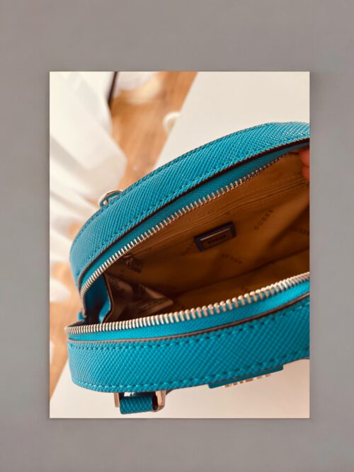 Mała torebka marki Guess w kolorze niebieskim, zasuwana na suwak, odpinany regulowany pasek.