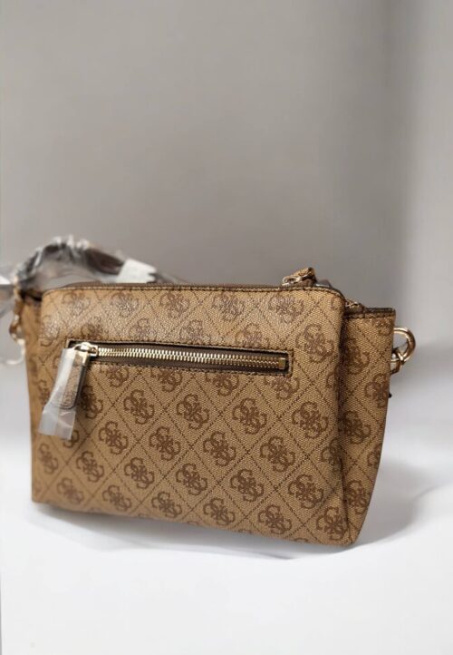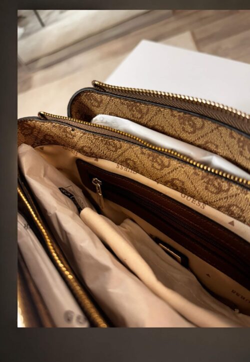Torebka damska marki Guess, wykonana za skóry ekologicznej. Posiada trzy komory: dwie otwarte i jedna zapinana na suwak. Cała torebka zasuwana na suwak. Z tyłu zasuwana kieszonka . Posiada metalowe nóżki, które zabezpieczają spód torebki. Regulowany odpinany pasek.